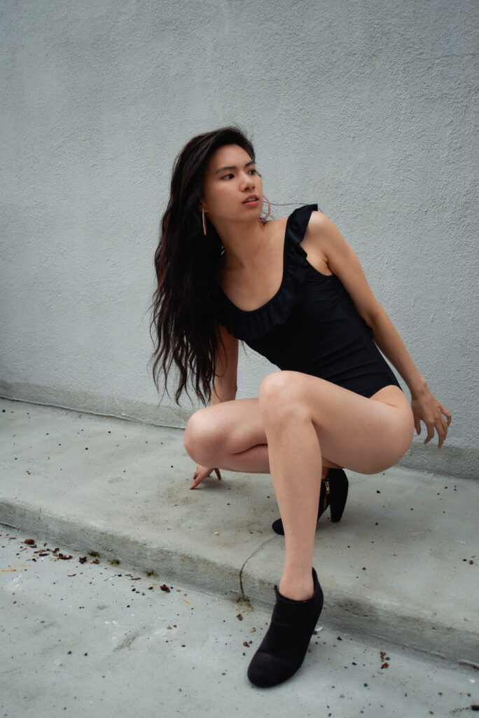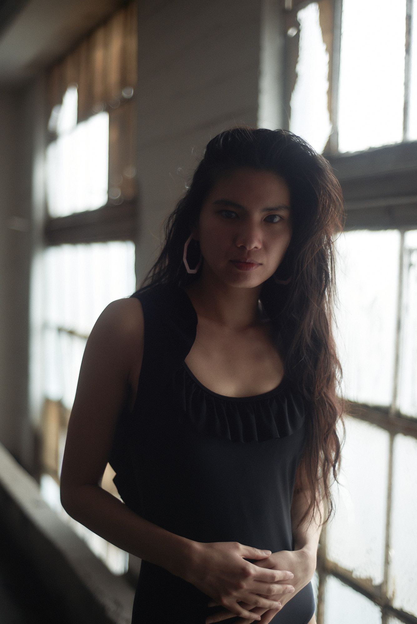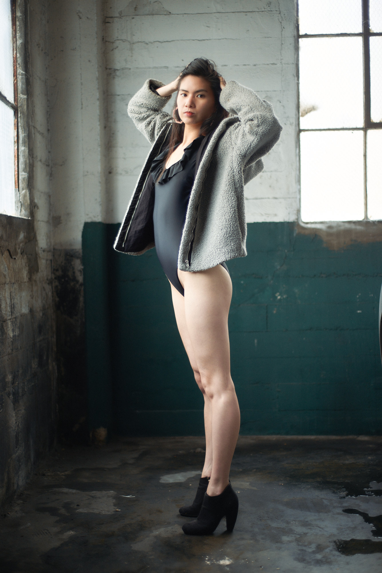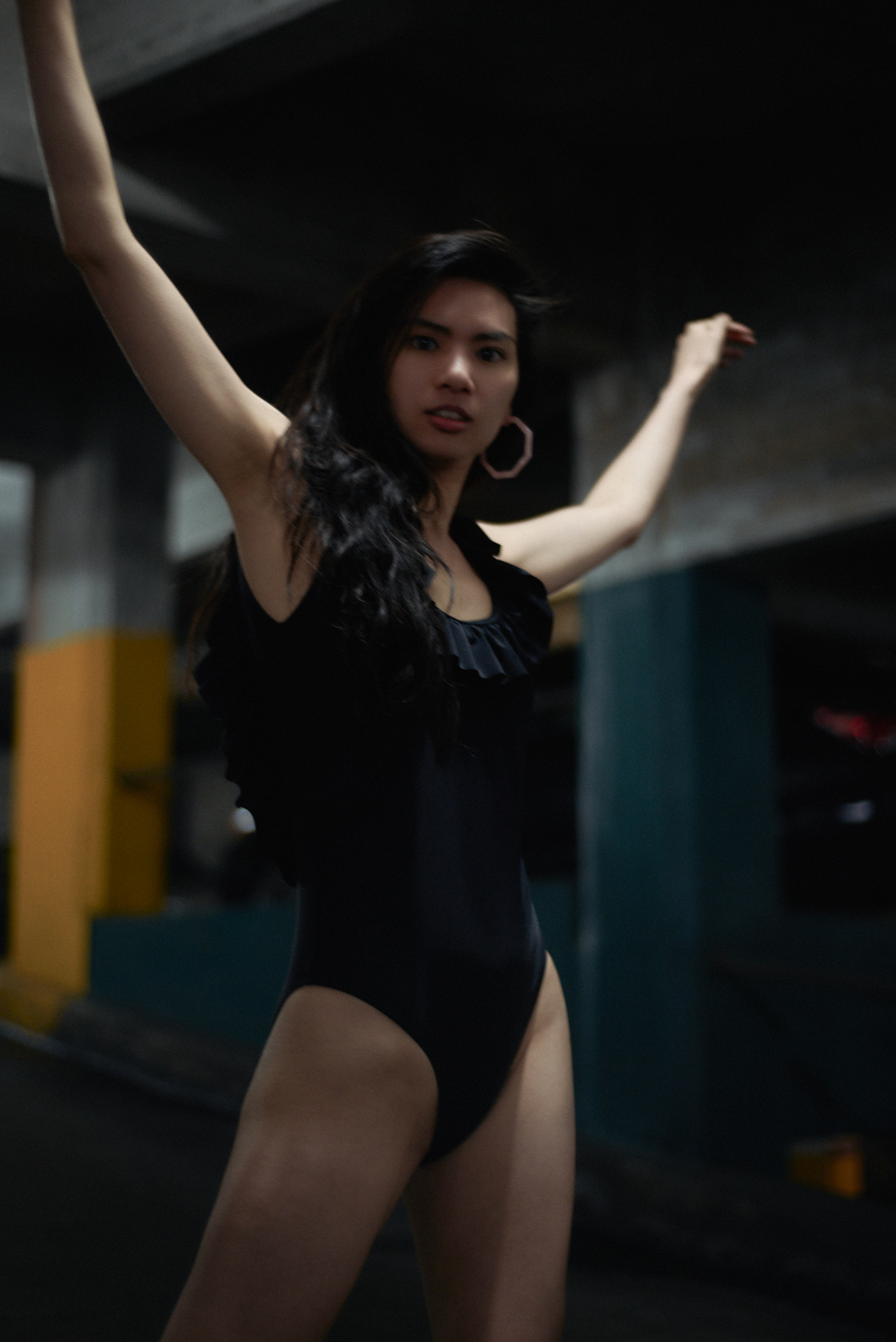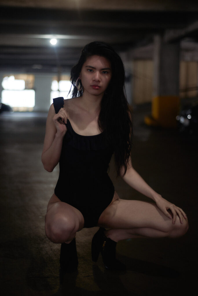 An editorial shoot with model, Em, on a rainy day in an Oakland Parking Garage.
