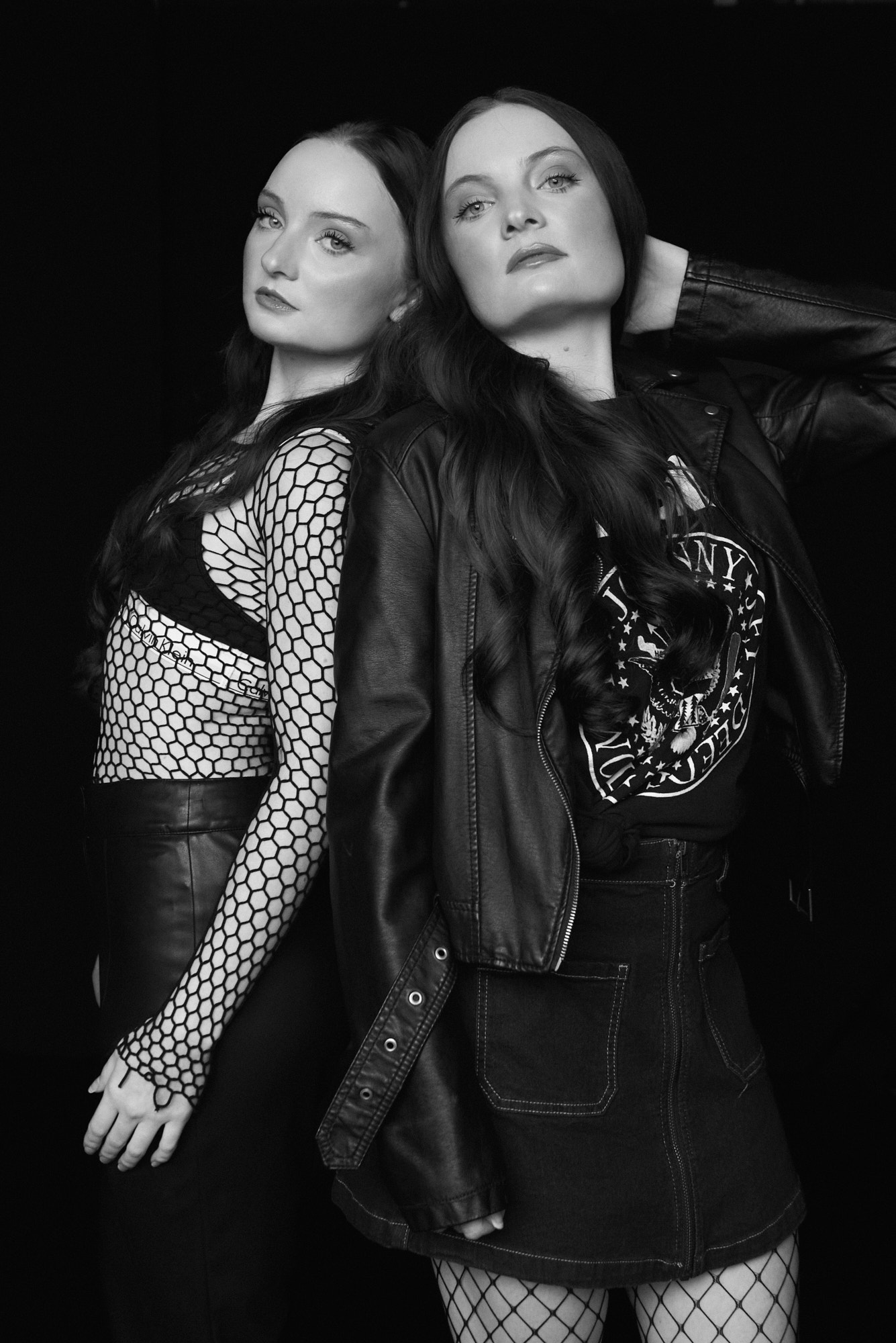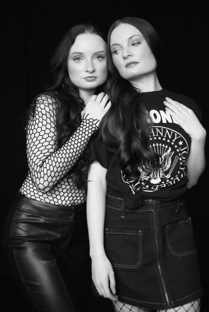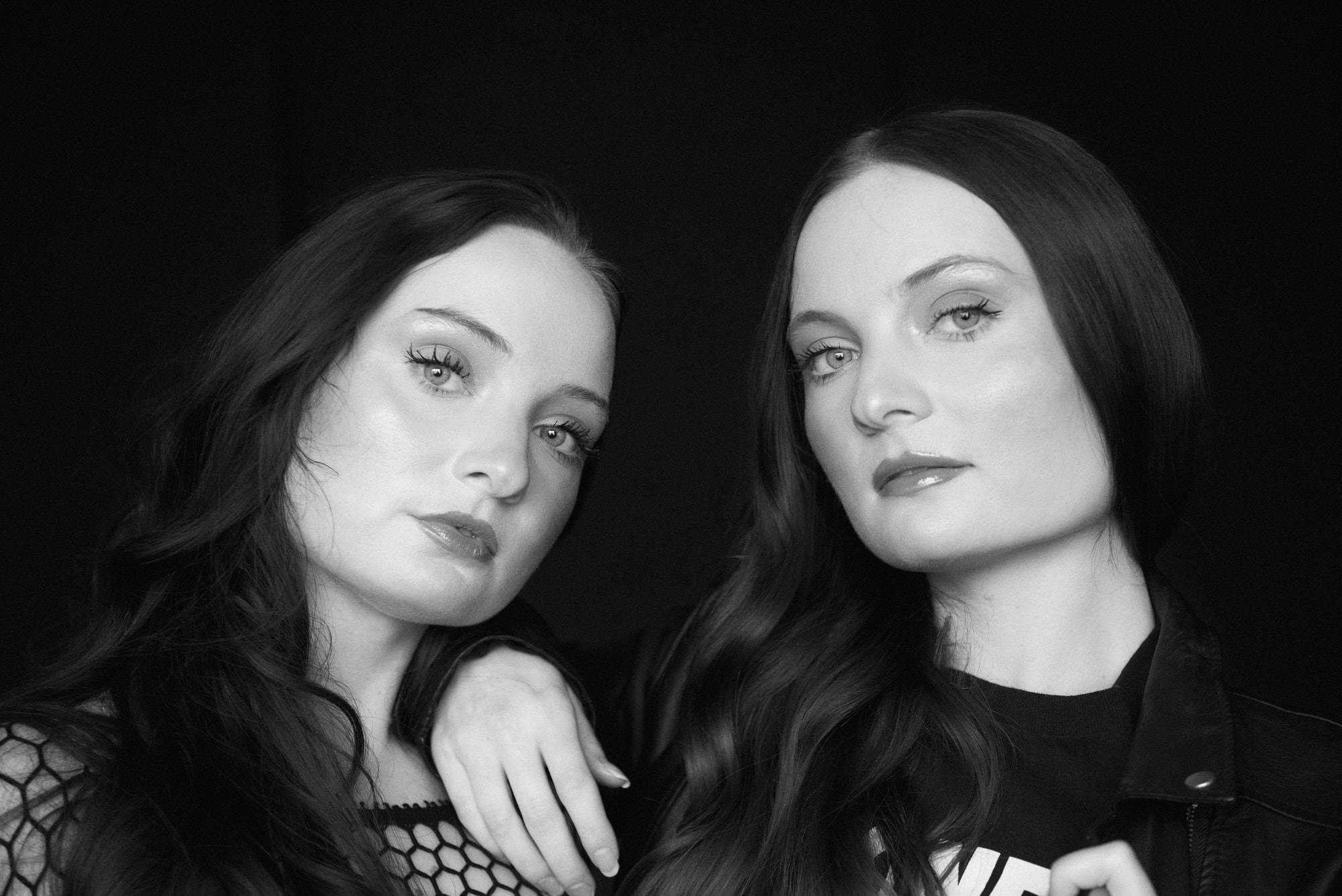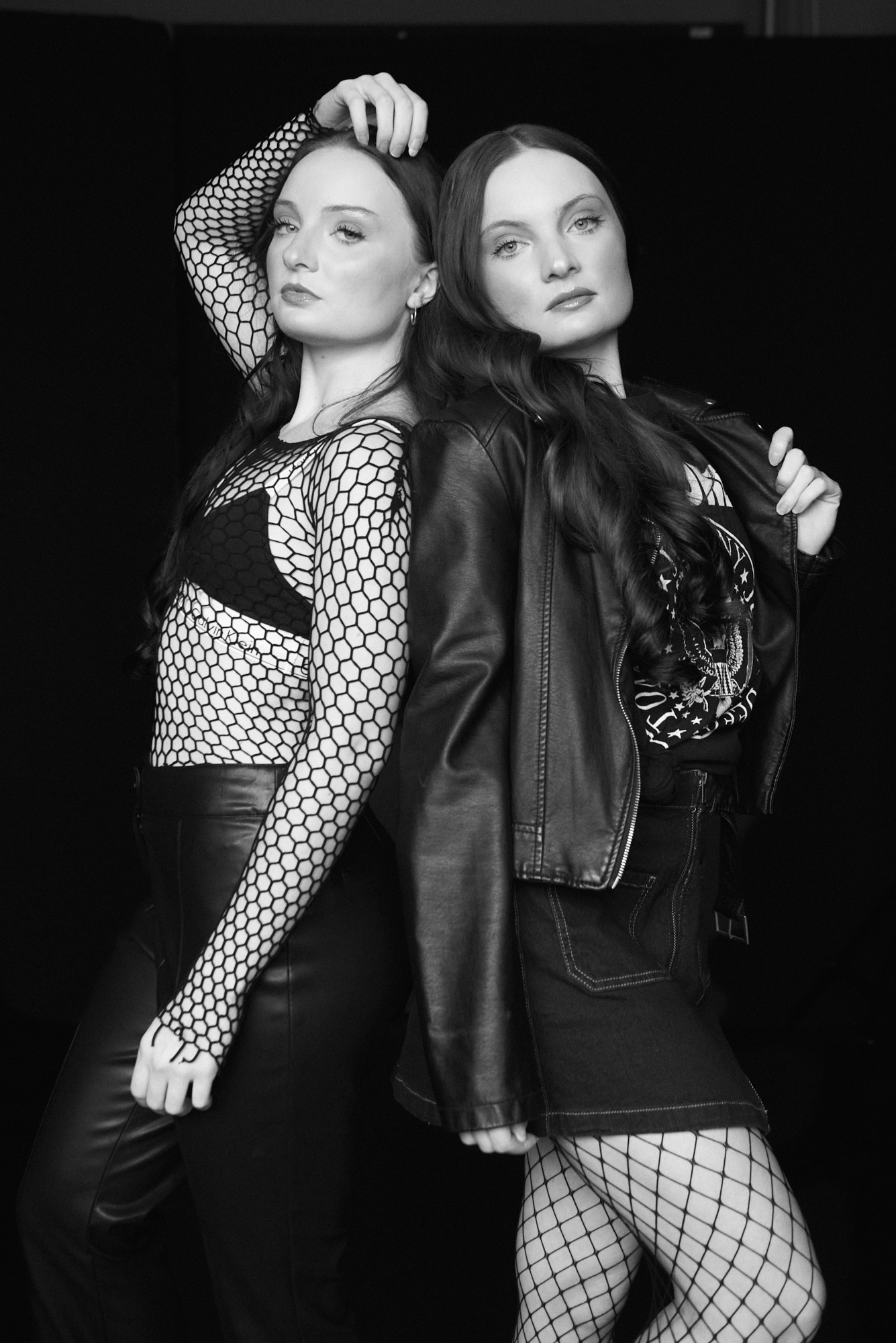 An editorial look using natural light against a black background in the studio with twin sisters, Ashley and Amber Roemer,