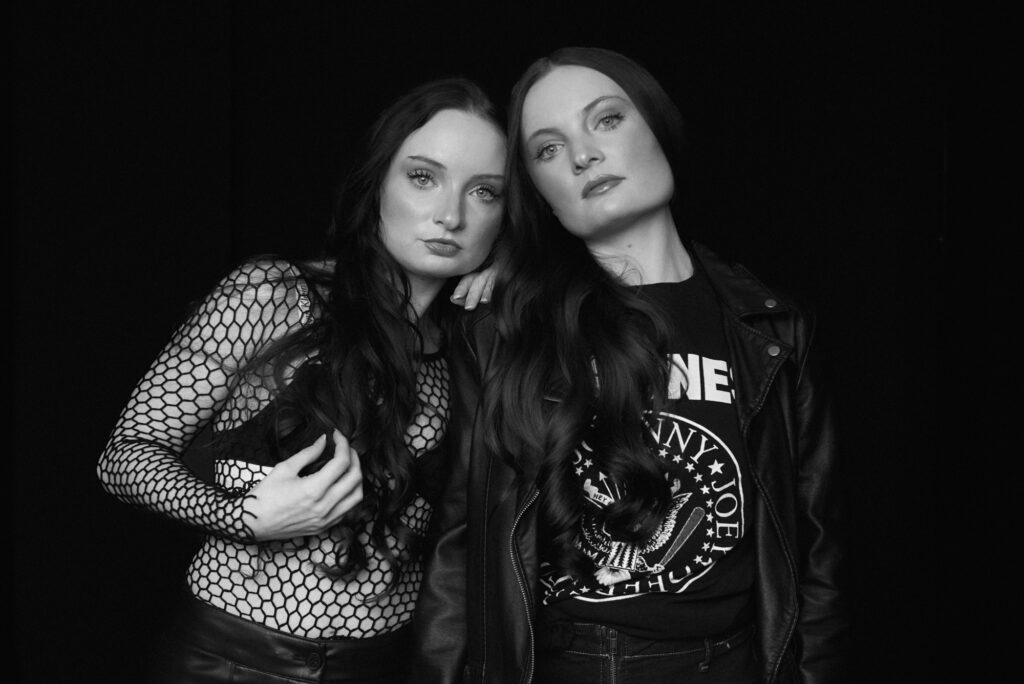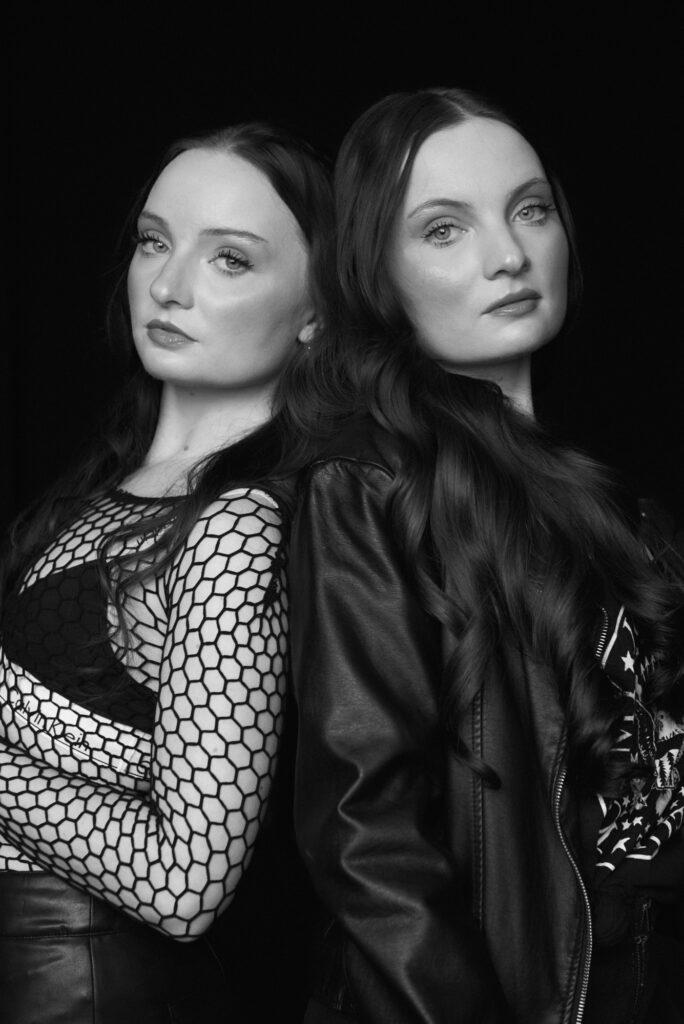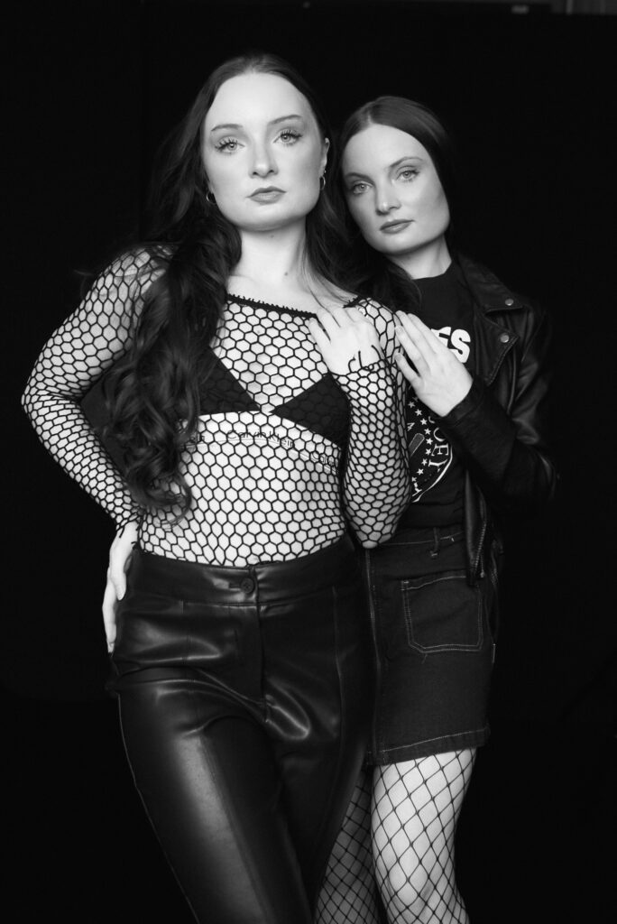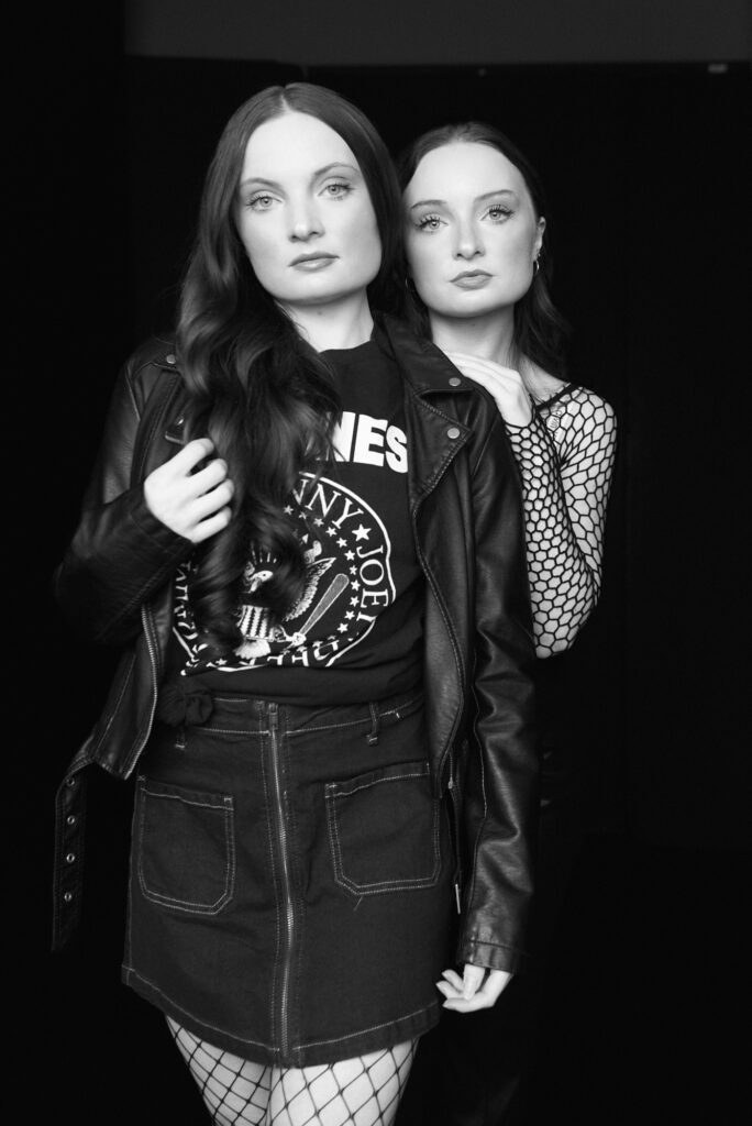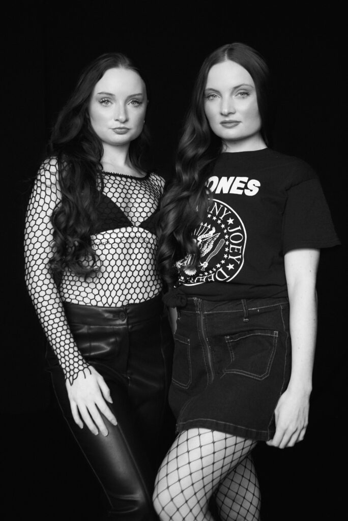 An editorial look using natural light against a black background in the studio with twin sisters, Ashley and Amber Roemer,